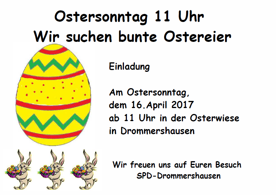 Der Osterhase ist dieses Jahr ein Frühaufsteher, denn das traditionelle Ostereiersuchen der SPD in Drommershausen startet am Ostersonntag bereits um 11Uhr in der Osterwiese. Alle Kinder aus Drommershausen und der Umgebung sind zusammen mit Eltern und Großeltern herzlich eingeladen. Das Eiersuchen findet auch bei schlechtem Wetter statt. Deswegen ist wetterfeste Kleidung erforderlich.