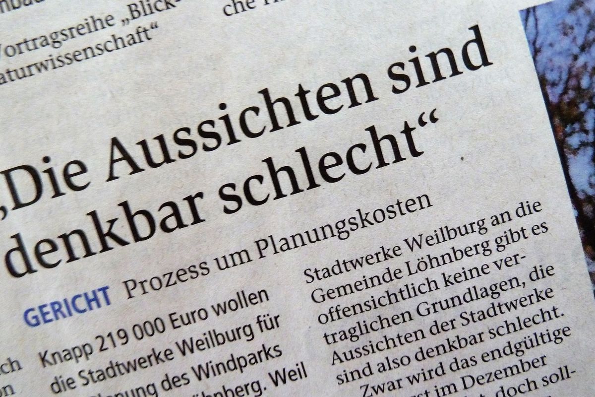Dem TAGEBLATT gebührt Dank und Anerkennung für seinen Bericht über den Prozess vor dem Landgericht Limburg. Dank und Anerkennung dafür, dass ein wichtiges Thema zeitnah auf der ersten Lokalseite präsentiert wurde. Aber auch dafür, dass der umstrittene Sachverhalt sachlich, detailliert genau und nachvollziehbar dargestellt wurde. Bereits die erste „Runde“ in der Güteverhandlung vor einigen Tagen hat Bemerkenswertes zutage gefördert: Für die Forderungen der Stadtwerke Weilburg an die Gemeinde Löhnberg gibt es offensichtlich keine vertraglichen Grundlagen, die Aussichten der Stadtwerke sind also denkbar schlecht.