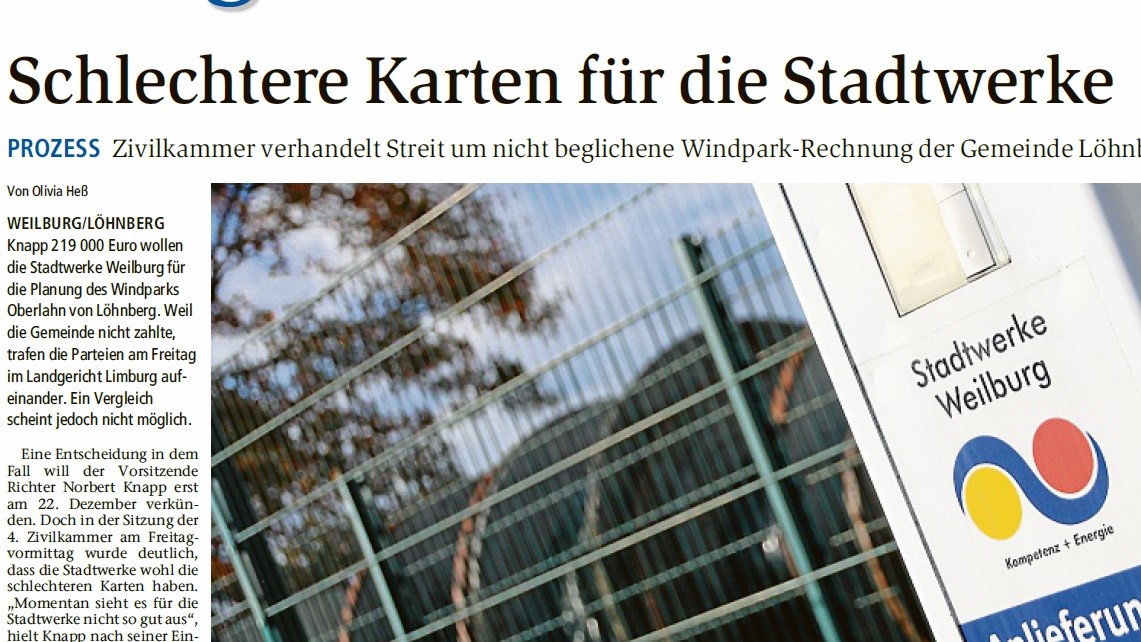 Knapp 219 000 Euro wollen die Stadtwerke Weilburg für die Planung des Windparks Oberlahn von Löhnberg. Weil die Gemeinde nicht zahlte, gab es einen ersten Termin im Landgericht Limburg. Eine Entscheidung fällt aber erst im Dezember.