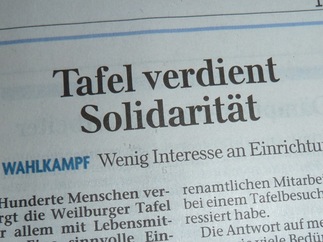Die Menschen im Lande sehen was Politikerinnen und Politiker tun, aber auch was sie nicht tun. Ein gutes Beispiel wird in dem Leserbrief im WEILBURGER TAGEBLATT vom 18.September 2013 geliefert. Bernd Ritter aus Ahausen hat darin die Arbeit der Weilburger Tafel gelobt und gleichzeitig die fehlende Beachtung durch die politischen Parteien in der Wahlkampfzeit kritisch angesprochen.