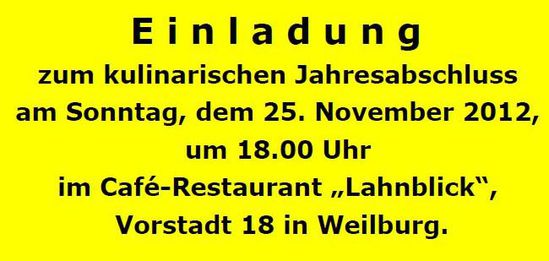 Einladung zum kulinarischen Jahresabschluss mit Ehrungen am Sonntag, den 25. November 2012 um 18.00 Uhr im Café-Restaurant „Lahnblick“, Vorstadt 18 in Weilburg