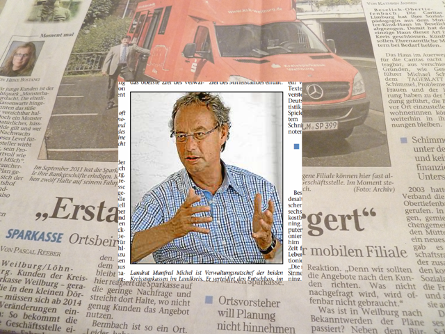 Die Antwort des Landrates im TAGEBLATT vom 25.10.2013 zum Wegfall der mobilen Sparkassen-Filiale in kleinen Orten des Kreises lässt aufhorchen, denn als Begründung werden reine wirtschaftliche Gesichtspunkte genannt. Die Bedienung kleiner Orte mit Bankdienstleistungen rechnet sich nicht und ist einzustellen. Klar und einfach. Hier herrscht Marktwirtschaft pur. Das Lebensmittelgeschäft ist schon weg. Der Bäcker auch. Ebenso der Metzger. Oder die Post – sie hat nur den Briefkasten zurück gelassen. Jetzt folgt die Bank.