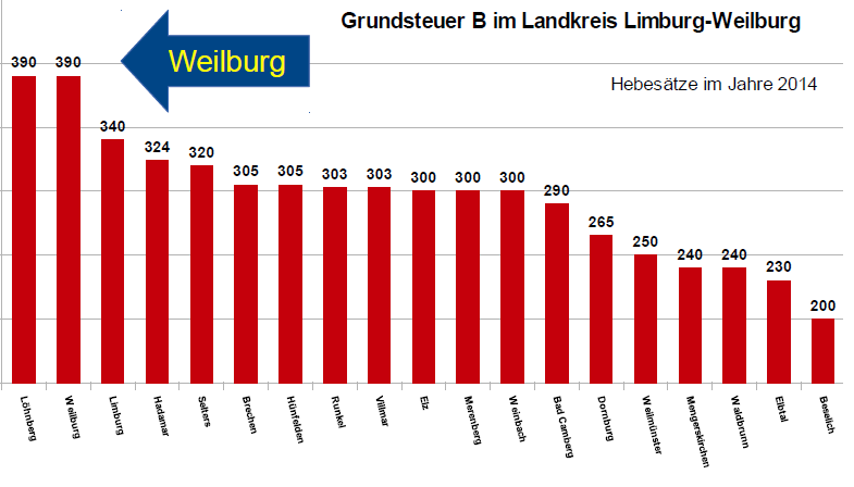 Die Grundsteuern 2014 im Landkreis Limburg-Weilburg im Vergleich. Mit einem Hebesatz von 390 Prozent hat Weilburg einen Spitzenplatz. Der Vorschlag für 2015 liegt auf dem Tisch: 470 Prozent. (bk)