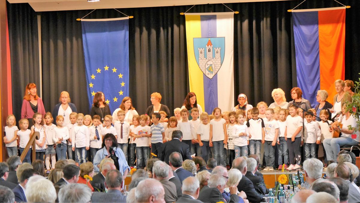 Foto: Ein musikalisches Dankeschön an Bürgermeister Hans-Peter Schick überbrachten die Kindergartenkinder der Stadt Weilburg, zusammen mit ihren Erzieherinnen.