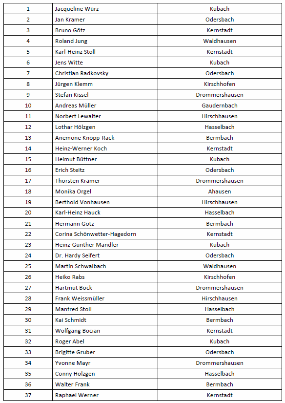 Insgesamt, auch diese bittere Wahrheit gibt es, geht jedoch die Bereitschaft für ein kommunales Engagement auf örtlicher Ebene zurück, berichtete der Vorsitzende. Die 43 Personen umfassende Gesamtliste wurde nach kurzer Diskussion und einigen Verschiebungen einstimmig bei einer Enthaltung verabschiedet.
