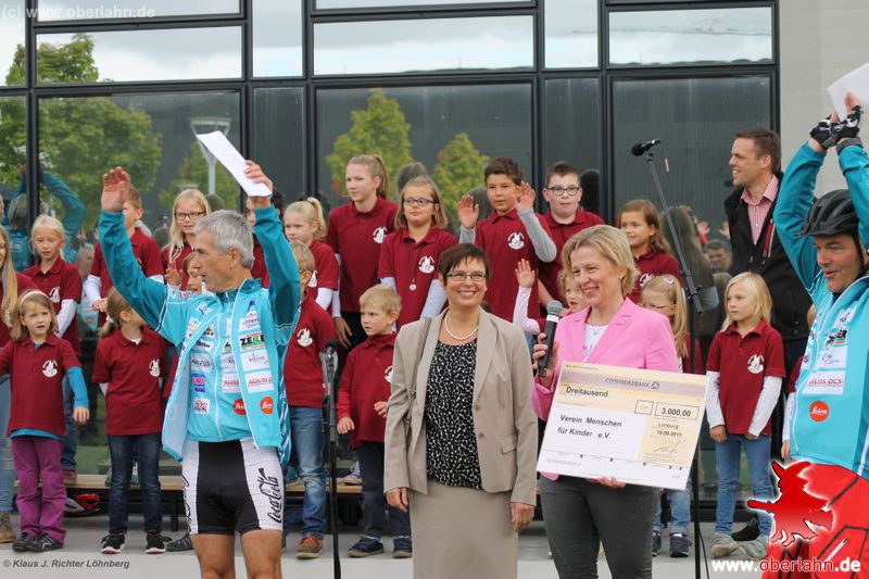 Im Jahre 2015 ist die Welt bei Mundipharma in Limburg noch in Ordnung. 500 sportbegeisterte Radfahrer kommen bei der Tour "Menschen für Kinder" vorbei und erhalten einen dicken Spendenscheck von der Unternehmensleitung.(Quelle: www.oberlahn.de)
