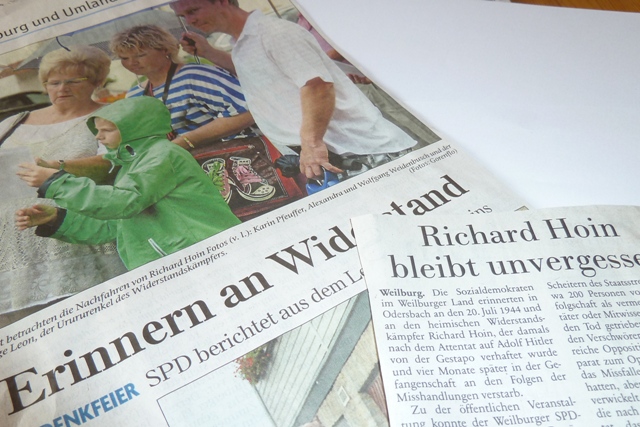 Die heimische Presse berichtet ausführlich über die Gedenkveranstaltung am 20. Juli 2014 in Odersbach. Unter der Überschrift "Richard Hoin bleibt unvergessen" berichtet Manfred Horz in der Nassauischen Neuen Presse und im WEILBURGER TAGEBLATT finden wir einen ausführlichen und großformatigen Beitrag von Sabine Gorenflo, mit dem Titel "Erinnern an den Widerstand".