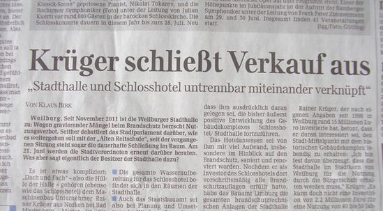 Die Konditionen für die weitere Nutzung sind jetzt klar benannt: Kein Verkauf, stattdessen Sanierung durch die Stadt Weilburg. Keine Trennung von Hotel und Halle, weil hier technische Gründe entgegen stehen. Bereitschaft der Verpachtung für weitere 40 Jahre zu günstigen Konditionen. Das sind die Rahmenbedingungen des Eigentümers. Details dazu fehlen noch und sind zu verhandeln.