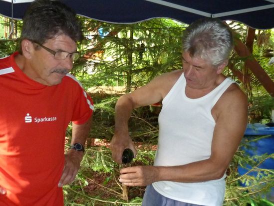 Der Erste Stadtrat Bruno Götz (li) probiert den Rotwein aus Kirschhofen