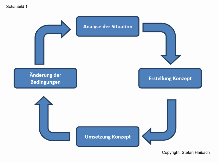 Zunächst ist auch nochmals der bisherige Erfahrungsschatz aller Beteiligten zu erfragen und auszuwerten, um ggf. aus bisherigen Fehlern Schlüsse ziehen und ein Gesamtkonzept mit vielen einzelnen Maßnahmen erstellen zu können. Es wird auch kein einmaliges Gesamtkonzept erstellt werden können, dass dann nur noch abgearbeitet werden muss und alles wird gut. Im Gegenteil, das Konzept wird immer wieder überprüft und überarbeitet werden müssen, da sich die Rahmenbedingungen ständig anpassen und verändern.
